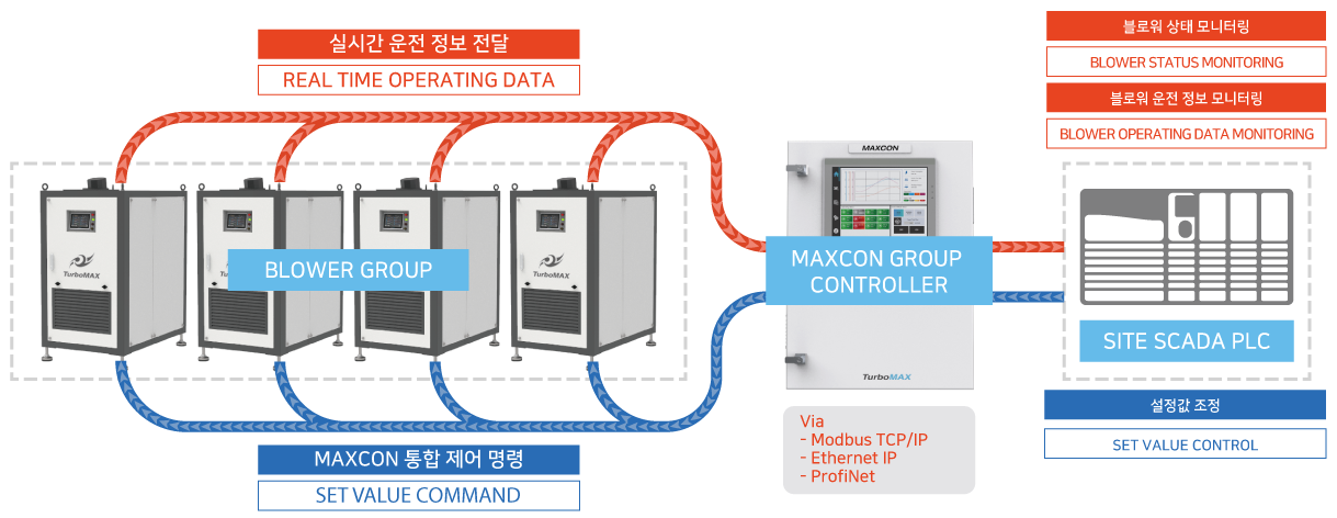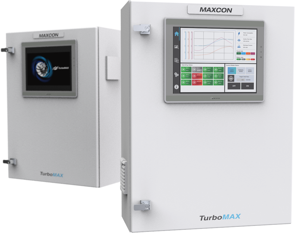 MAXCON собирает большое количество данных о работе воздуходувки в режиме реального времени и регулирует скорость потока через наиболее эффективную рабочую точку и оптимальное количество рабочих воздуходувок для снижения энергопотребления всей системы.